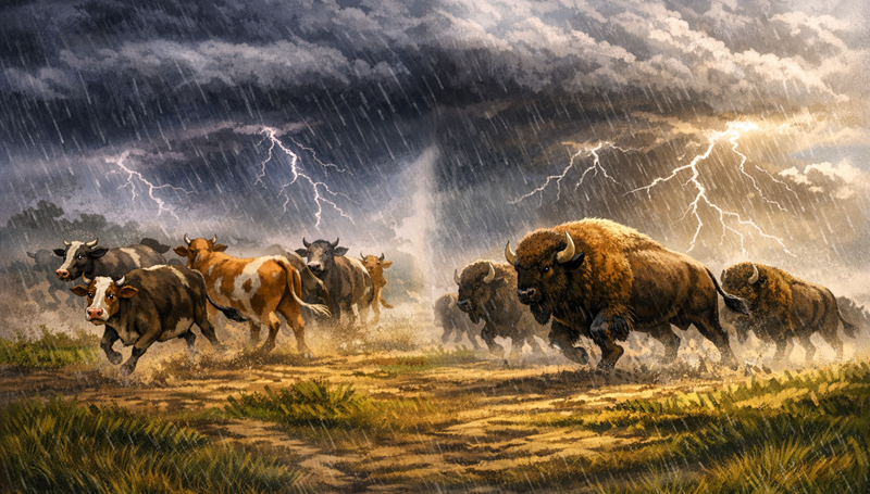 অন্যদিকে, বাইসন ঠিক উল্টো আচরণ করে। তারা ঝড় আসতে দেখলে ঝড়ের দিকেই এগিয়ে যায়। তারা এটা জানে যে, ঝড়ের ওইপাশে আছে প্রশান্তি! ঝড় থেকে না পালিয়ে মূলত, তারা ঝড়কে মোকাবেলা করার সাহস দেখায়। এতে করে তারা ঝড়ের ভেতর কম সময় থাকে এবং দ্রুত বিপদ অতিক্রম করতে পারে। বাইসন জানে, সমস্যাকে পাশ কাটাতে গেলে তা দীর্ঘস্থায়ী হয়; বরং সরাসরি মোকাবিলা করাই উত্তম। এটি হলো সাহস ও কৌশলগত সিদ্ধান্তের প্রতিফলন।